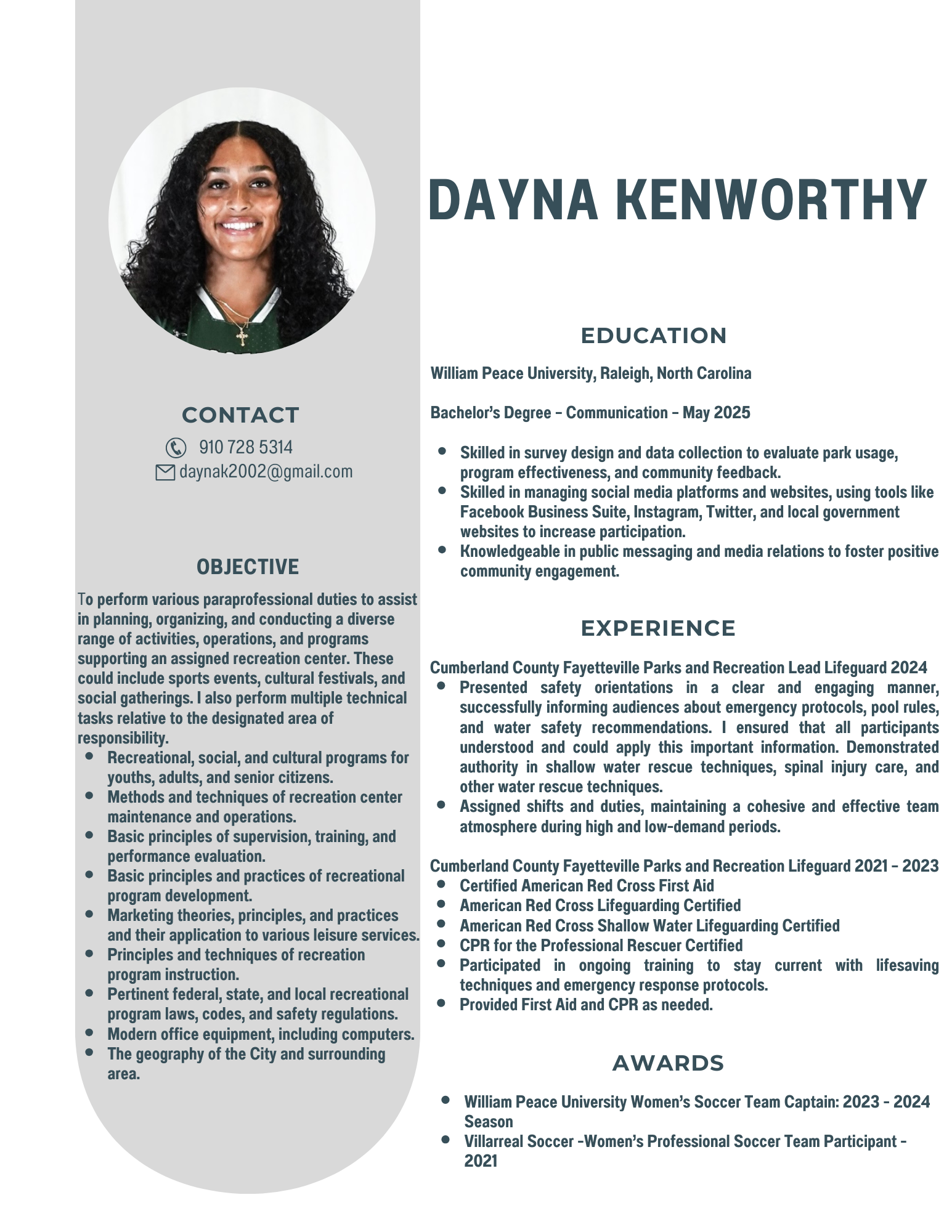 Hi, I’m Dayna Kenworthy — a Communication major at William Peace University, graduating in May 2025. I’m passionate about building strong, engaged communities and creating meaningful experiences through recreation, outreach, and public messaging.